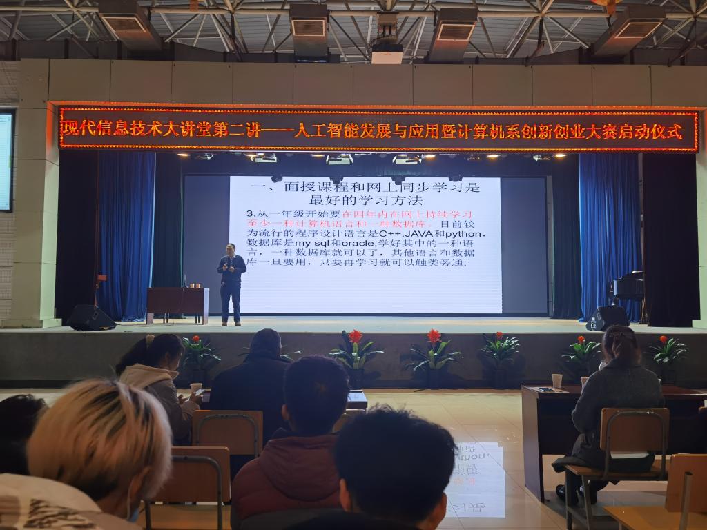 为响应学院第九届“我敢闯,我会创”创新创业大赛的开展,引导、鼓励广大学生踊跃参加各类型的创新创业活动,切实培养和提升计算机系学生专业学习能力,我系于12月2日晚在大学生活动中心举办计算机系创新创业大赛启动仪式暨现代信息技术大讲堂活动。本次大会邀请到西安理工大学计算机学院张璟教授为主讲、优秀毕业生淡玉瑞、计算机系主任缪相林以及学工办辅导员到场参会,系创新创业负责人范文彬主持本次会议。