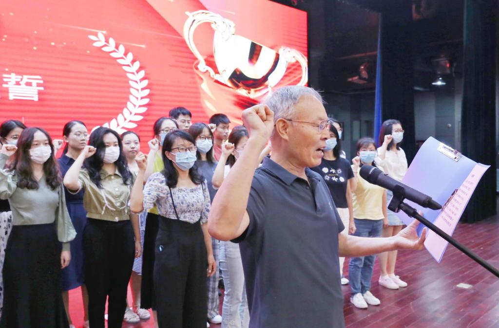 学生代表电信系曾一丹同学在发言中对各位老师致以节日的问候,感恩老师的辛勤付出和关怀指导。随后,由教授会主席王海民教授上台领誓,全体新入职教师上台并右手握拳宣誓,做出庄严的师德承诺。