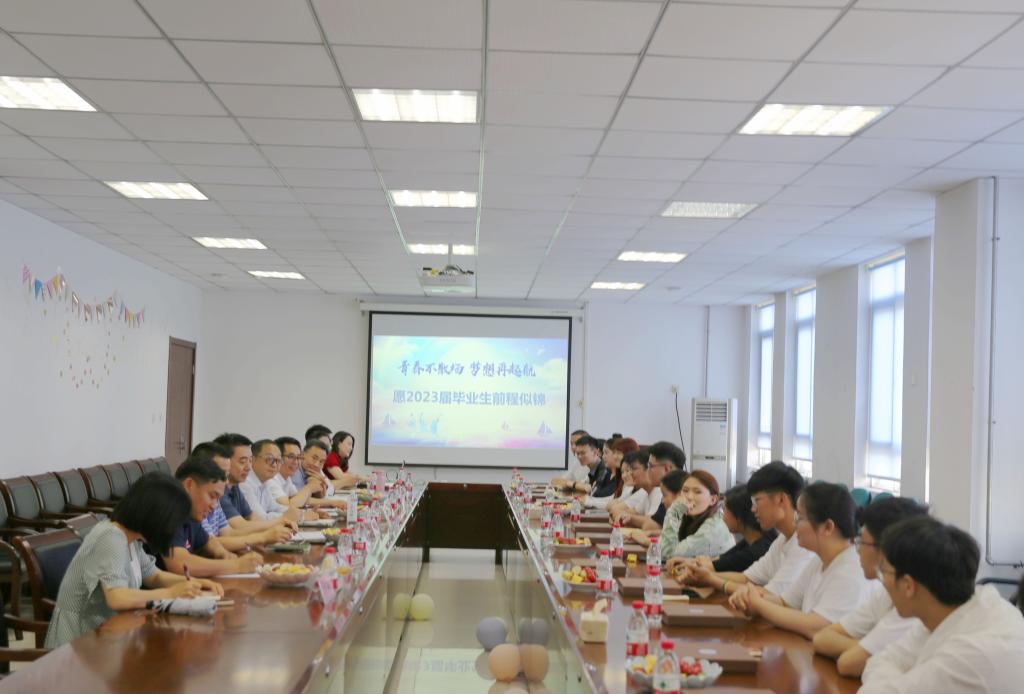 毕业寄深情,离别送嘱托。为欢送学院2023届毕业生,引导毕业生积极为学院的发展建言献策,6月21日下午,学院召开了2023届毕业生座谈会。学院党委书记张爱萍、副院长朱旭、副院长岳华海、院长助理张学堂、工会主席冀祥、保卫部主任陈涛、党政服务中心副主任米梅、学生服务中心副主任吴昊翔、条件保障部主任助理张帅等出席会议。座谈会由学院张爱萍书记主持。