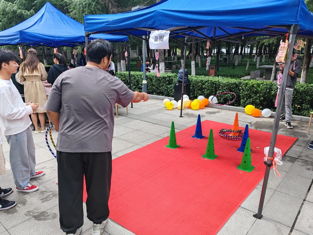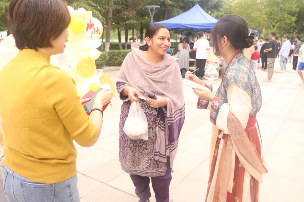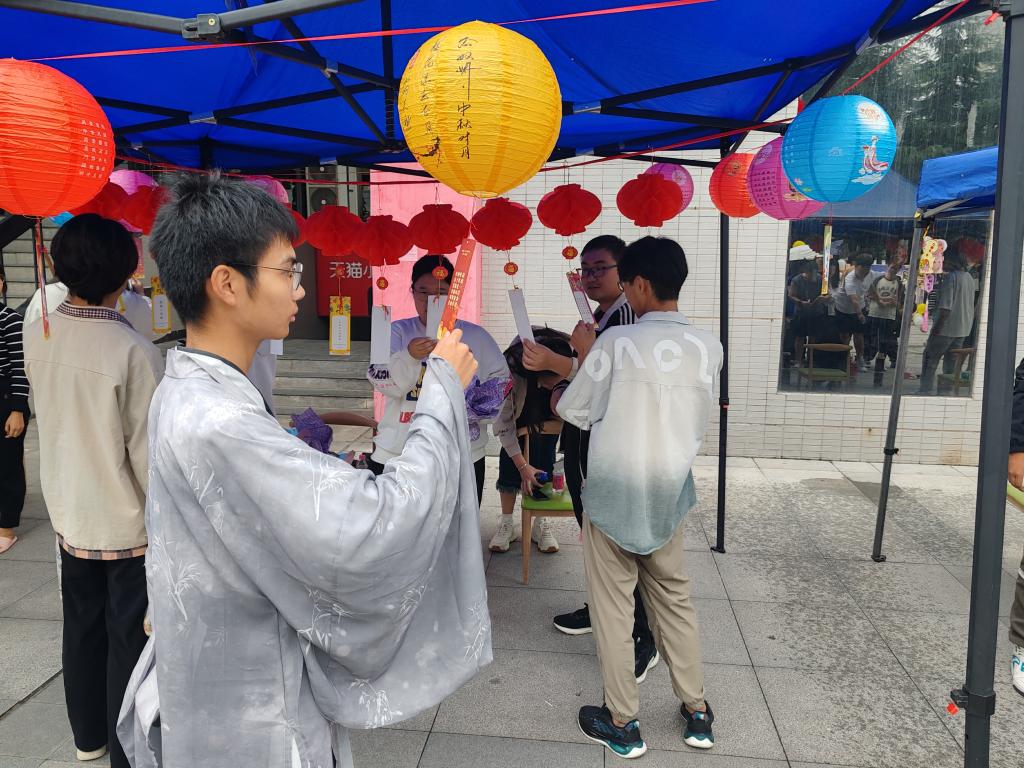 “海上生明月,天涯共此时”。为了弘扬中国传统文化,学生们身着古装,带着百余首经典诗词与其他人对诗互动。套圈、投壶、猜灯谜和画团扇等活动也让同学们留恋忘返、欢声笑语不绝于耳。外籍教师Nosheena在活动现场学写中国字,打卡主题墙,一同感受中国传统节日的乐趣。张爱萍书记与学工队伍、中快餐厅经理等一起为学生赠送爱心月饼、水果、饮料和礼品。活动现场“饼”香四溢,师生同乐,充满着歌声、笑声、喝彩声,洋溢着浓浓的节日气氛。