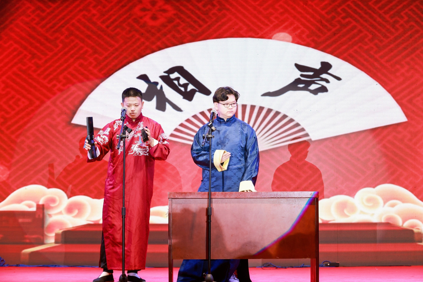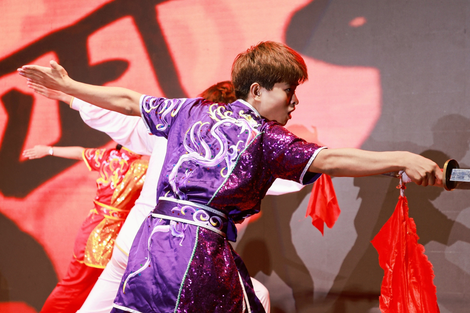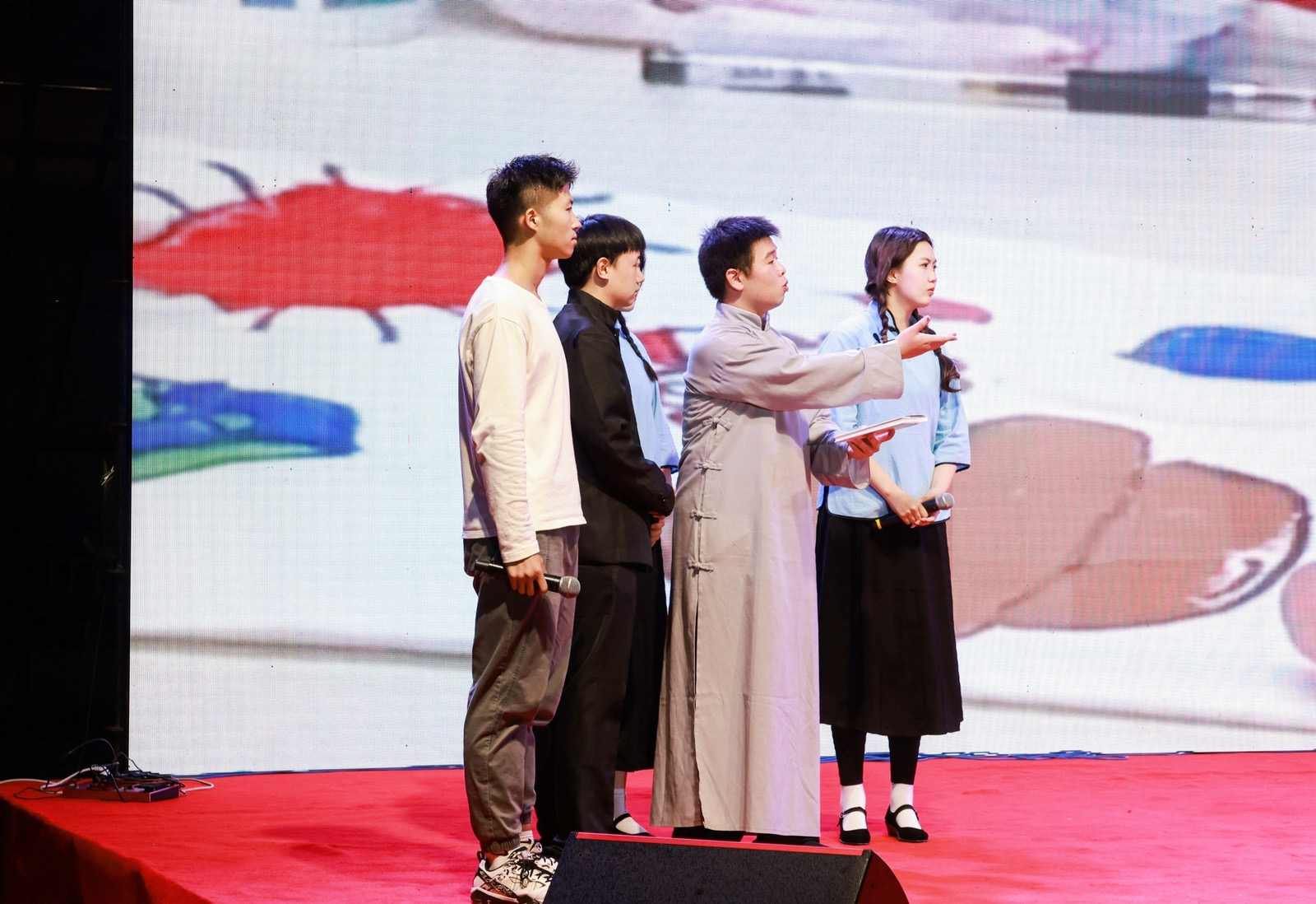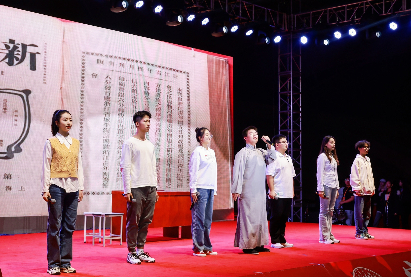 第二篇章“共赏芳华”开始便被一首动感十足的流行歌曲《全是爱》点燃全场,爵士舞《All the way》的女同学们活力四射,动感的舞姿充满了青春校园的气息。带有民族特色的旗袍走秀《国风楚韵》和相声《同仁堂》引来场下阵阵欢呼声。话剧社和“城市之光”宣讲团同学带来的话剧《追民族最亮的“星”》将“何为青年,青年何为”的坚定理想信念和勤思笃学的求真品德烘托到高潮,用充满激情的表演和朗诵为新同学们树立起了榜样的标杆和前行的方向。