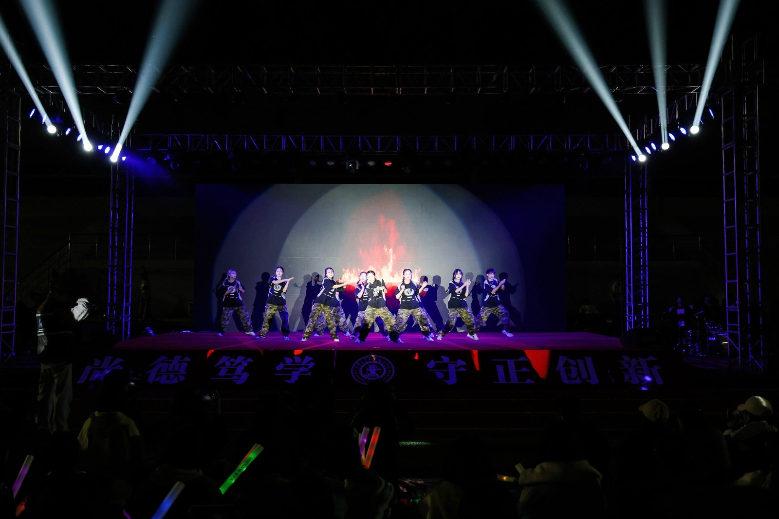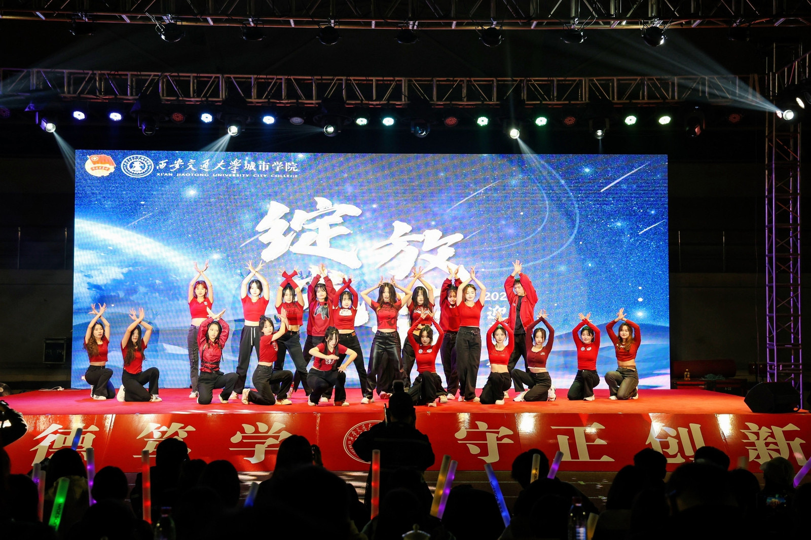 “逐光而行,追光前行”,接近尾声的第三篇章由音乐社和吉他社带来的一首充满力量的歌曲《生活因你而火热》,高亢的歌声引起毕业生阵阵共鸣,晚会现场灯光绚丽、节奏欢快、气氛热烈。由街舞社带来的精彩热舞《Doctor papper》点燃了全场的热情,变化纷繁的背景下,动感十足的舞蹈,尤其是新生代表杨爱玲和程思雨酷帅有力的舞蹈动作让观众尖叫不断。一支由武术队带来的《以武会友》结合气势磅礴的音乐,刀剑行走、虎虎生风,展现了中华武术之“魂”的魅力,器械、拳法动作将中华功夫的神韵的气势展现得尤为奥秘,引起台下掌声不断。保卫祖国的战士,泱泱华夏,熠熠山河,随着国旗护卫队带来的《军礼》讲述将晚会推向了的尾声,李志林等四位退役军人同学,他们激情澎湃地讲述着自己的入伍经历,观众们的掌声热血沸腾,纵使青春的汗水打湿衣衫也永远让人怀念少年的我们有着青春独特的意义。一场又一场精彩的表演展现了同学们高超的才艺。晚会的尾声以辅导员代表和新生代表的朗诵结束,《追光者》的朗诵和歌曲表达对自由的向往,对梦想的坚持,他们用最充沛的情感表达着对西交大城院的赞美和感激之情,为本次的活动画上了圆满的句号。