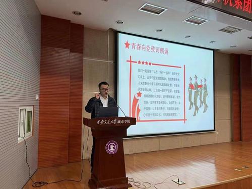 我系教工支部书记杨恩宁老师为本期“青马班”作开班致辞。杨老师结合他在工作多年的亲身体会,倡议各位学生骨干树立远大理想,积极进取,共同以青春报效祖国。“青年一代有理想、有本领、有担当,国家就有前途,民族就有希望”,杨老师以习近平总书记针对青年工作的相关论述为引,为学员们讲述了青年一代应如何担当起新时代的责任与使命,成长为祖国富强、民族复兴伟大事业中的中坚力量。他以“请党放心•强国有我”为主题,告诉青年学子,要牢记初心使命,开创美好未来,同时教育同学们学习党史,感悟思想,坚定的学习贯彻党的创新理论。杨老师着重指出,新的征程上,我们必须坚持党的全面领导,不断完善党的领导,增强“四个意识”,坚定“四个自信”,做到“两个维护”,牢记“国之大者”。杨老师为我们讲述了青年应有的的职责与担当,并带领全体参会人员进行宣誓,在振奋人心的誓言后,带领大家观看了庆祝中国共产党成立100周年大会记录视频,让那份热血在每个人心里滚滚流淌。