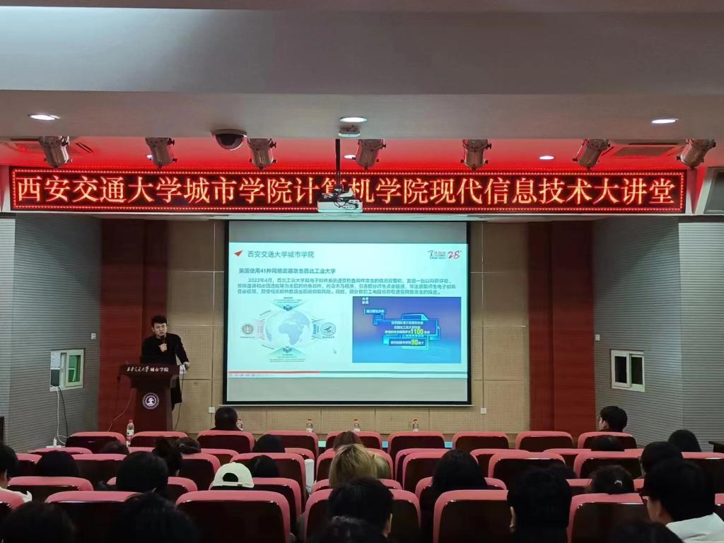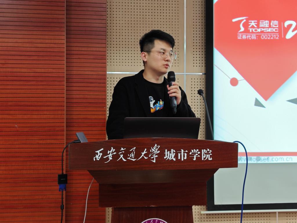 为增强大学生网络安全意识、更好地了解网络安全专业,beat365亚洲版官网邀请北京天融信教育科技有限公司于11月30日在F100举办题为“现代信息技术大讲堂-信息安全与技术分享”讲座。北京天融信教育科技有限公司西安分公司李瑞港经理,计算机学院实验室主任胡朋,辅导员康乃馨、刘浩楠参与此次讲座。此次讲座由计算机学院学工负责人崔佳楠主持。
