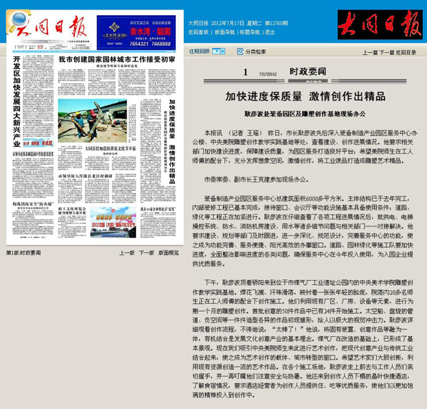 2012年7月17日的《大同日报》在头版以《加快进度保质量 激情创作出精品》为题报道了雕塑营活动。