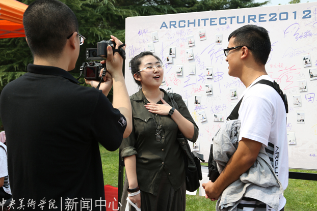 建筑学院服务点,老生正在对新生进行采访