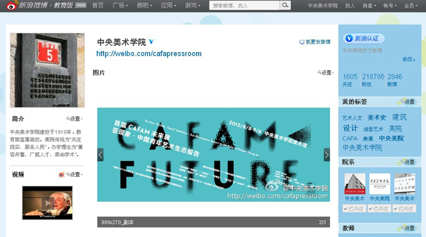 我院官方微博(http://weibo.com/cafapressroom)于2011年3月1日正式开通,学院积极运用新媒体及时传播美院信息、与网友互动,目前拥有20余万粉丝,开设有“美院新闻”、“图说美院”、“咱美院人”、“早安美院”、“平安美院”等多个栏目,充分发挥了学院新媒体外塑形象、内聚力量、多角度育人的作用。