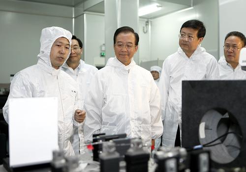 9月14日,中共中央政治局常委、国务院总理温家宝应邀到清华大学看望师生,并在学校大礼堂发表演讲。这是温家宝在机械工程学院精密仪器系IC装备重大专项实验室考察。新华社记者 鞠鹏 摄