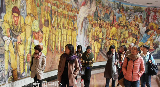 观看油画系师生为平津战役纪念馆创作的大型油画《胜利交响诗》