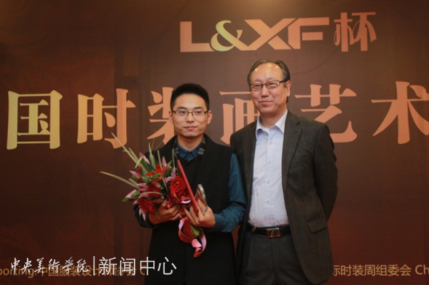 中国服装设计师协会主席李当岐为金奖选手赵伟伟颁奖