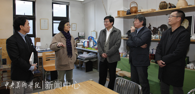 第九工作室是这次唯一走访的工业设计专业点,导师江黎教授介绍了工作室专业培养的目标,强调当代设计与传统工艺材料的结合。当谈到产品专业实验资源和实践空间问题时,高书记鼓励各专业应充分发挥美院品牌优势,通过美院先进的人才培养理念吸引社会投入,借助校外优质资源实现自我发展。