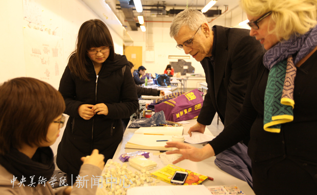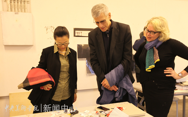 Stephen先生首先前往各专业工作室进行参观。专业老师们再次见到项目的老朋友都感到十分高兴并详细地向他介绍了目前专业课的进展以及开学以来完成的几个课题情况。学生们热情地向仔细观看自己创作的Stephen院长介绍了作品和创作理念。