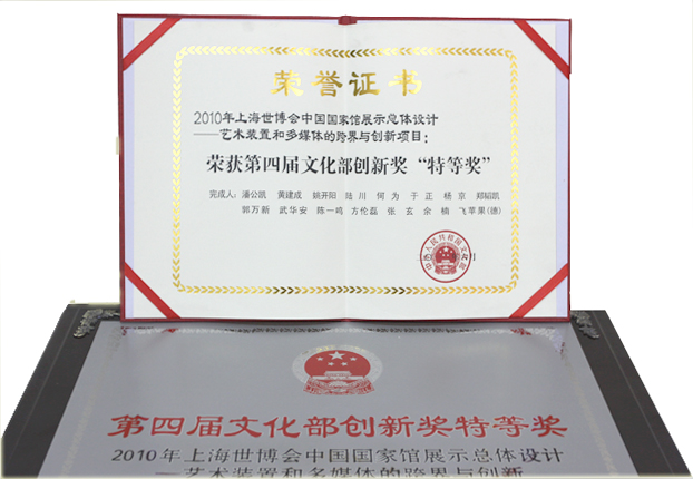 2012年12月7日,由文化部主办的第四届文化部创新奖颁奖仪式暨第五届中国文化创新高峰论坛在滁州举行。我院院长潘公凯教授带领团队完成的“2010年上海世博会中国国家馆展示总体设计——艺术装置和多媒体的跨界与创新”项目荣获“第四届文化部创新奖(特等奖)”。由我院城市设计学院副院长黄建成教授代表出席并领取获奖奖牌。“2010年上海世博会中国国家馆展示总体设计”项目设计团队由多名专家组成,潘公凯院长担任中国国家馆展示设计团队总策划兼艺术总监,黄建成教授担任中国馆展示设计团队设计总监,项目成员包括姚开阳、陆川、何为、于正、杨京、郑韬凯、郭万新、武华安、陈一鸣、方伦磊、张玄、余楠、飞苹果(德)。此次获得创新特等奖的还有中国农民歌会组织模式的创新与实践、政府公益文化基金管理创新、数字新媒体技术在“数字版清明上河图”项目上的展示与应用项目。