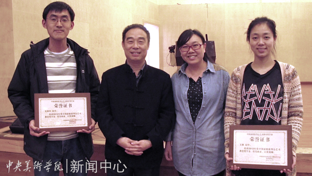 人文学院曹丽老师、获奖学生毛翔宇、王薇与中国嘉德董事副总裁蔻勤先生合影留念