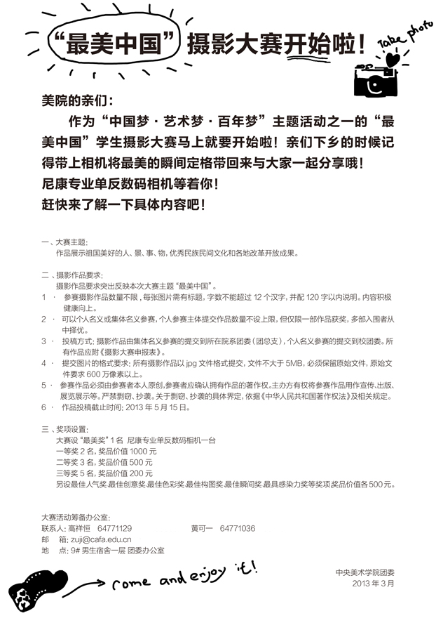 目前,“最美中国”学生主题摄影比赛已全面启动,同学们将利用下乡写生实践期间进行摄影创作,反映美丽中国、魅力乡土与文化精萃,学院将于六月组织专业教师对征集作品进行评优表彰,并举办优秀作品展览。