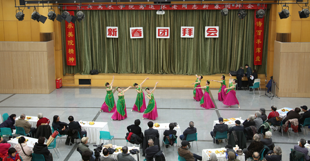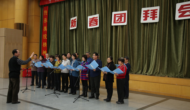 团拜会上,离退休老同志代表表演了精心准备的节目。舞蹈《笑颜》表达了老同志对生活的热爱与辞旧迎新的喜悦心情,合唱《游击队员之歌》、《复兴之路》以饱含深情的歌声唱出了大家对于伟大祖国的热爱。在音乐的伴奏下,老同志们纷纷走上舞台,用矫健的舞姿展示了美院老同志们青春不老、昂扬向上的精神风貌。