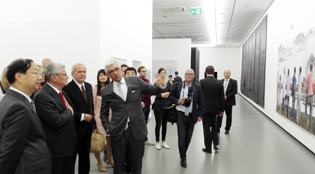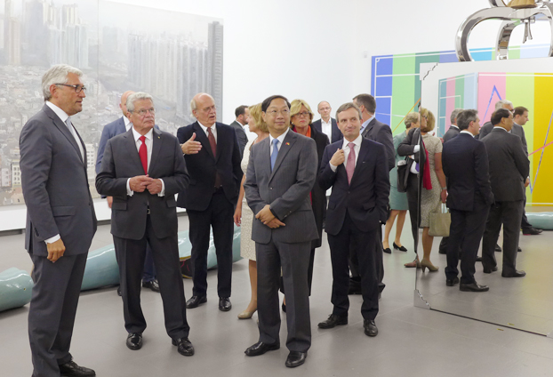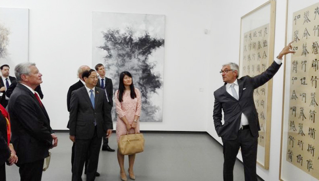 正在德国展出的“中国8——中国当代艺术展”迎来了一位重要参观嘉宾,2015年9月1日下午,德国联邦总统高克专程前往杜塞尔多夫参观了“中国8”展览,中国驻德国大使史明德、文化参赞陈平、北威州文化部长舍费尔(女)、杜塞尔多夫市长盖塞尔、波恩艺术文化基金会主席斯迈林以及北威州参与该展的9家美术馆馆长和专题策展人陪同参观。