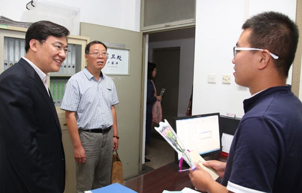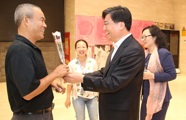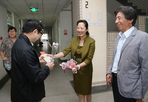 一只粉色康乃馨,一本等待书写的小本,一张彩色贺卡,伴随着一声问候温暖了这个有些凉意的初秋。9月10日一大早,教师节,院长范迪安,书记高洪,副院长苏新平,副书记王少军,院长助理、教务处长王晓琳等一行敲开一扇扇教室、办公室的门,为正在课堂上讲课、在各自岗位上忙碌的一线教职工送去节日问候。