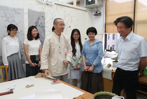 窗外细雨绵绵,油画系一工作室的林笑初老师在两个班里穿梭,认真指导学生写生人物画;壁画系四工作室的宁方倩老师被学生围着,耐心地示范如何用笔;中国画学院花鸟画系二年级教室里,姚舜熙老师正在讲构图,“春催桃李满天下,雨润栋梁竖九州”,“博学多识领风骚,严于律己为师表”,学生们书写着对姚老师的祝福都悬挂在对面的墙上……这是今天的画面,也是美院每天都在进行的授业解惑的故事。