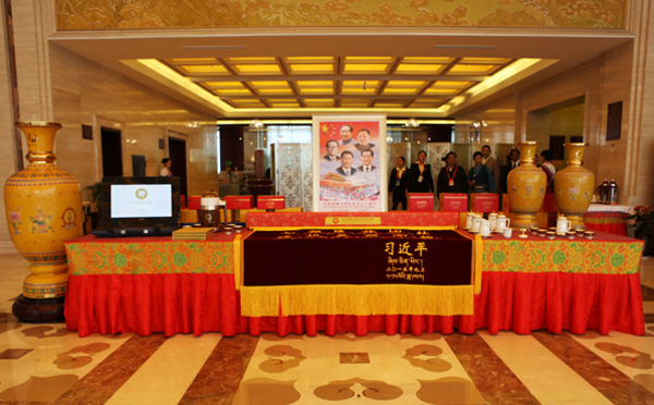 伴随着中共中央政治局常委、全国政协主席、中央代表团团长俞正声向西藏自治区赠送习近平总书记题词“加强民族团结建设美丽西藏”贺匾,中央代表团向西藏赠送的8件礼品陆续揭开神秘面纱。