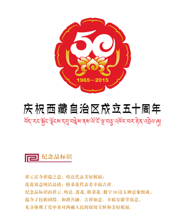 纪念品标识设计由祥云、哈达、莲花、格桑花、数字50这五种意象构成。主体是一朵盛开的八瓣格桑花,中间盛开的莲花向上托举着数字50,象征西藏自治区成立的历史。两侧对称分列随风飘扬的哈达,红、黄、白三色相间。祥云富含祥瑞之意;哈达则代表了美好祝福;莲花象征高雅纯洁;格桑花寓意幸福吉祥。这些图像蕴含了民族团结、和谐共融和幸福安康等美好寓意,充分体现了党中央对西藏各族人民的深切关怀和美好祝福。