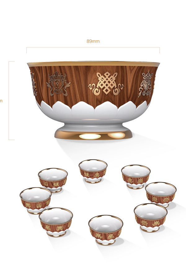 酥油茶杯套装,以骨质瓷为材料,器口圆润,整体造型细腻稳重,美观典雅。杯身饰以木质的纹理,上绘寓意佛法的吉祥八宝图案,杯底为圣洁的白色莲花向上托举着杯身。这些装饰元素象征了吉祥如意、平安幸福。