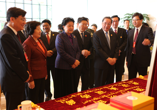 党委书记高洪向中央代表团领导介绍纪念品的设计情况