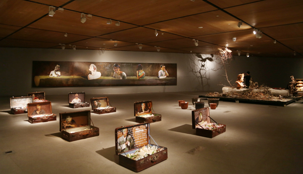 此次展览以“三条命”命名,旨在彰显王华祥的多重身份,也为突出他充满活力的存在状态、创作状态、思考状态,具体到艺术家身份,映衬他“版画家”、“素描大师”、“油画家”三层身份。展览展出了王华祥早年以《贵州人》为代表的一系列经典版画和油画创作,同时也展出一批显示创作线索的小稿、素描稿,展览也以展墙文字的形式对其“将错就错”理论进行了重申解读。此次展览的主体部分是艺术家最新创作的“开合地”系列装置,这也是王华祥首次尝试将绘画与现成品结合起来进行创作,一个个打开的皮箱,树枝、鲜花、石膏教具、木偶、调色板等用树脂固定在箱子之中,这些物件也是王华祥绘画作品中常见的。王华祥对这些熟悉物件的关系进行打破,并以嫁接、挪用的方式重组,营造出一种具有戏剧性的现场,亦激活了观众对油画“物性”的深度思考。