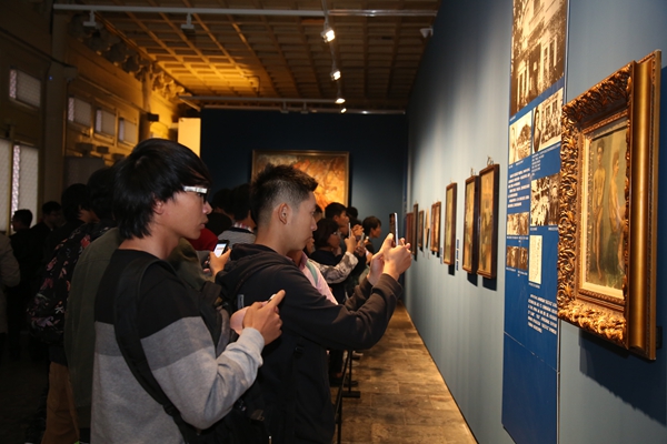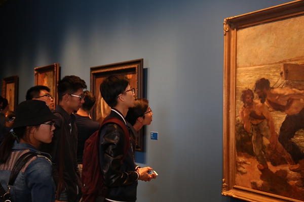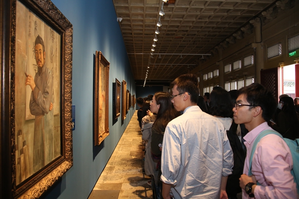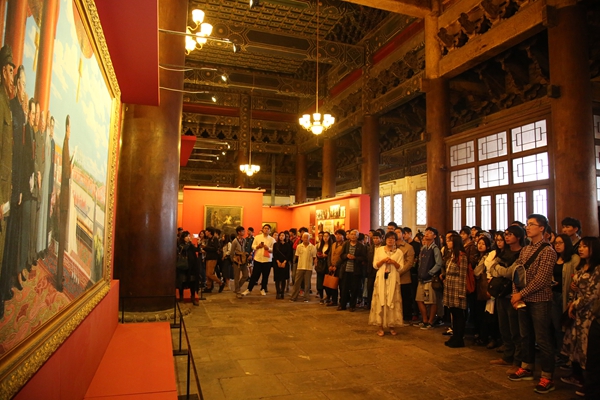 “从晚清民初油画初入中国的传播到新中国成立后油画民族化、出现大量经典作品,从改革开放新一批大师的出现到当代油画家对社会深切的人文关怀。”郭红梅老师系统的讲解,让同学们进入了近代油画发展的历程。“来到梦想中的美术学院,没想到第一节专业课竟然是在这样一个艺术殿堂。在这个特殊的上课地点学习中国文化,了解美院历史,让我了解到为中国造型的意义”,“匆匆太庙之行,却饱览多幅以前如雷贯耳的名作,加上老师充满激情与真诚的讲解,深深地感染了我”,对于大一新生周宏博、李泉颖他们来说,这样的专业课是新鲜的,触摸经典更能留下深刻地印象。200余幅代表中国油画百年历程的经典之作,一百年的油画,这是中国油画的历史,这也是中央美院发展历程的缩影,“这次活动是基础部主任张路江老师策划的,第一堂专业课,让这些刚刚进入美院的孩子认识美院的传承,认识中国油画百年所走过的路程,给学生一种深层次的启发,让他们对自己即将从事的专业有更多的认识。”带队的基础部副主任李荣林谈到了“第一课”的重要性。