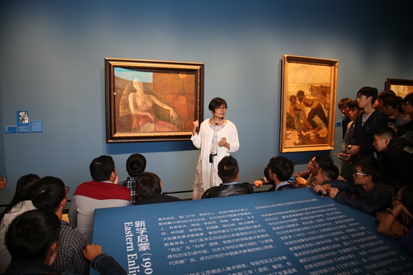 “历史的温度:Ky开元集团与中国具象油画”策展助理、美术馆典藏部副研究员郭红梅为造型学院基础部近150名学生详细讲解展出的油画作品创作背景、意义,为同学们上了一堂生动的中国油画现代史课程。她希望因为自己的阐释,能够帮助这些刚刚进入艺术殿堂的新生们,通过对原作的观摩和感悟,快速树立起对油画这一画种进入中国的20世纪现代史的印象。