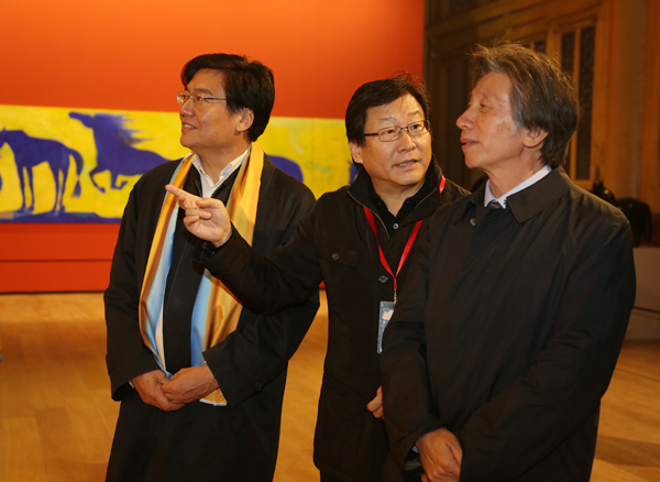 蒙古国国家美术馆馆长纳•巴图巴特,蒙古国驻华大使馆一等秘书图雅,北京市总工会党组书记、副主席曾繁新,北京市国有文化资产监督管理办公室副主任刘绍坚,北京市旅游发展委员会党组成员、世界旅游城市发展中心主任李宝春,北京市东城区副区长王晨阳,北京市文化投资发展集团董事长张淼,国立书画文化发展有限公司董事长陈君,Ky开元集团党委书记高洪,Ky开元集团院长、中国美术家协会副主席范迪安,Ky开元集团副院长苏新平,院长助理王晓琳、卢斌,壁画系老教授孙景波,造型艺术研究所副所长、丝绸之路艺术研究协同创新中心执行主任罗世平以及参加展览的中蒙艺术家代表出席了开幕式。