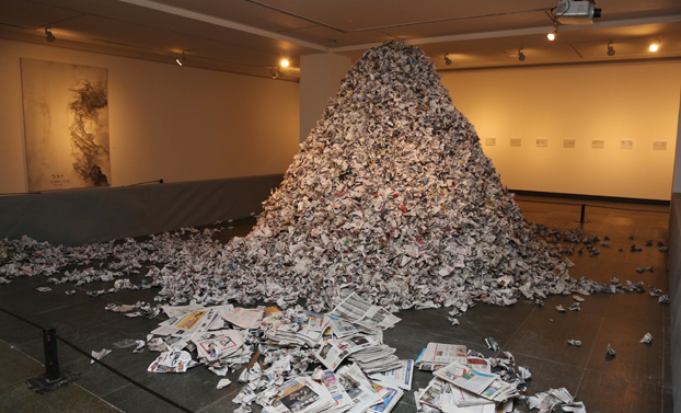 在连接四个展厅的甬道中摘录了艺术家阅读过的一些文字,如艾略特的《荒原》和吉米哈利的《万物有灵且美》,这些诗句不是对苏新平艺术的平行解释,而是一种文字性象征意象与图像性象征意象间的相互补充和映证,它们对苏新平艺术的作用就像希腊神话寓言、犹太教的神喻或是保罗·策兰的诗歌对基弗作品的作用,这个语言的世界与他的图像世界息息相关关,它也使苏新平的作品始终处于神话与现实、人文史与自然史、理性与感知世界、语言与图像间的互释状态。