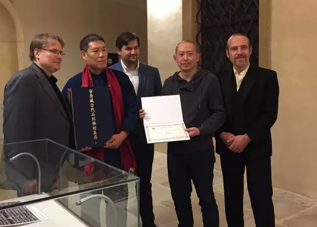仪式在捷克国家图书馆具有悠久历史的十字教会厅举行,馆长Kroupa教授主持了捐赠仪式并对此套书的撰集者钱士利、编辑与设计者武将表示由衷的感谢,为能拥有此套代表中国佛教经典遗存的宝贵资料而深感欣慰。