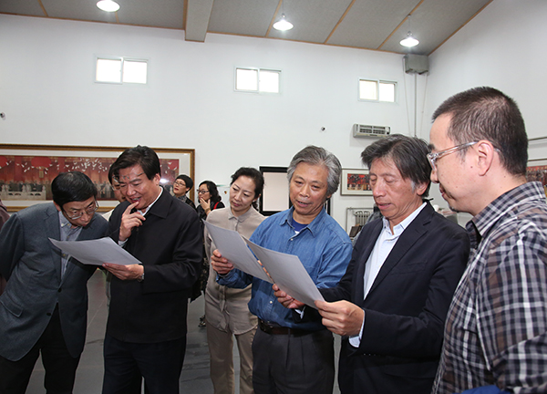 党委书记高洪、院长范迪安召集班子成员、学术委员会代表及有关学科的学术带头人到唐勇力先生的画室现场观摩