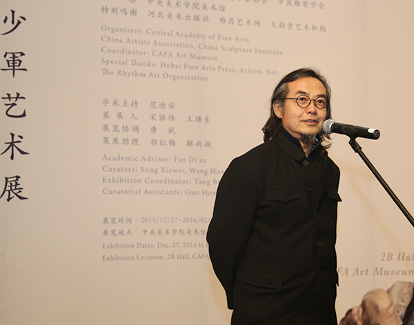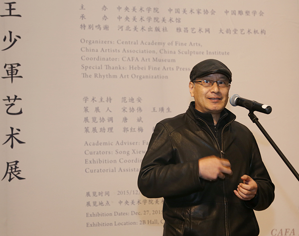 吕品昌代表雕塑系和中国美术家协会雕塑艺术委员会致辞,他谈到,在雕塑界,在当代艺术圈,王少軍不是弄潮儿,也并不活跃,但是他的作品有足够的分量和厚度,这来自于超逸的艺术品位和人文气质,来自于他宽阔的视野以及深度的艺术思想,同时来自于他对当下文化把握的自信。他从来不迎合时尚、潮流,用自己独立的思考,去面对和审视发展中的东西方文化,从中找到自己的落脚点和学术方向。