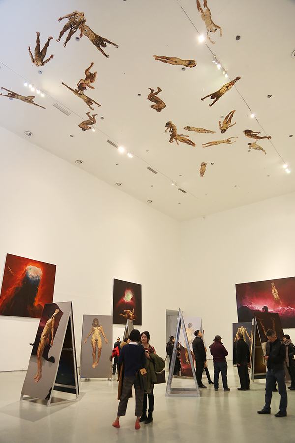 此次展览展出的系列作品开始于2013年,充分体现了袁元艺术实践中所具有的“棱镜”特质:在展厅中,数十块2米高的镜面不锈钢板上转印着姿态各异的男、女人体,以不同的角度装置在展厅空间。在大尺幅的架上绘画上,带有神秘色彩和抽象意味的宇宙空间图像,与不锈钢镜面绘画组成迷宫般的阵列。