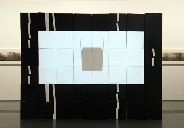 在此次展览中,《无中生有》作为占据展厅中心的木版装置,基于对形和法度规则的讨论而创作。展厅以三百余木刻盒子布置成两排并行而又间断的八组体块,像是高两米余的黑色碑阵,与美术馆原有墙体之间营造出了三条通道,观众需要不断地移步换景穿行于展厅,才能窥得展览全貌,而盒子的外立面则由众多不规则的黑底白纹的痕迹组成了一幅幅不可名状的抽象图景。