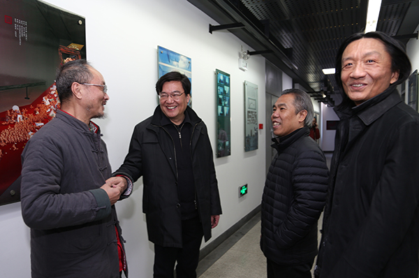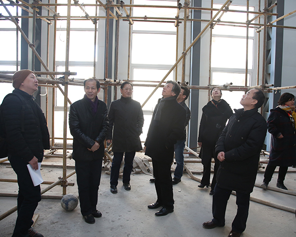 在燕郊校区,范迪安院长还来到正在建设施工的教学楼项目工地考察,仔细听取了基建处、施工单位中建二局三公司关于工程进展情况的汇报,并深入到施工现场,检查公共空间、文化课教室、阶梯教室、地下展厅等位置的施工情况。走访结束后,基建处、燕郊校区管委会、城市设计学院、附中等单位负责人向学院领导简要汇报了新学期工作重点与目标。院长范迪安提出,随着京津冀一体化进程发展,燕郊校区在学院整体发展中将发挥更加重要的作用,校区各单位部门要把握好国家“十三五”规划开局之年的大形势,贯彻落实学院第二次党代会精神与发展目标,强调创新发展,加强制度建设,科学整合配置教学资源,完善行政管理机制,高标准地推动各方面工作进展。
