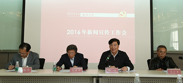 党委书记高洪在讲话中充分肯定了新闻宣传工作取得的成绩,他指出,中央美院新闻宣传工作有很好的传统,是发挥中央美院在中国美术事业和美术教育事业引领作用的重要保证。新闻宣传工作始终牢牢把握正面宣传的方针,积极宣传党的路线、方针、政策,特别是学校党委贯彻党的教育方针、文艺方针,注重宣传学校的历史使命和责任、义务,特别是当前形势与学校事业发展的各方面工作,注重以美院师生为主体,积极宣传师生在教学、科研、创作、服务社会等各方面的成果。他强调,当前和今后一个重要时期的任务,就是要认真学习贯彻习近平总书记新闻舆论工作座谈会重要讲话精神,加强和改进中央美院新闻宣传工作。高洪结合学校全面深化改革,实现百年辉煌的目标任务,提出了几点意见:一是把握正确导向,凝聚中央美院全体师生的力量,为全面建成具有鲜明中国特色的世界一流美术学院而努力奋斗。通过新闻宣传,构建凝聚美院人心的中央美院文化场,将美院现阶段要完成的任务告诉每一个人。二是创新新闻宣传的方式方法,善于利用最新媒介手段,通过具体、鲜活、生动、感人的故事,反映中央美院的主流、特色、亮点,反映中央美院师生的学习、工作、成长、发展,反映中央美院人的业绩、成果和贡献。三是落实责任担当,把好新闻宣传的导向关,切实提高新闻宣传的影响力。“中央美院新闻宣传员要做美院文化的传播者、美院风貌的记录者、美院发展的推动者。”他希望大家能够在围绕中心、服务大局中找准坐标定位,牢记责任使命,提高业务能力,推出有思想、有温度、有品质的好新闻作品,天天有“美院好新闻”。