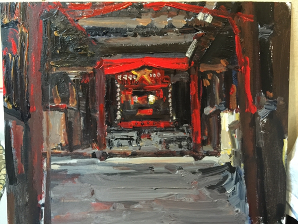 先观察,快入手,再入心,逼着同学们从简单的画面技法培训中被“揪出来”。白天,学生根据自己的偏好与选择,分散在不同的红色旧址进行创作。晚上,石煜老师再约2到3个学生进行针对辅导,看作品、评画。“我鼓励学生在这个阶段,要敢于把一幅画画‘坏’,要勇于打破束缚,用创作的思路看待写生课程,在画事物本体的过程中,加入自己的情怀,再运用绘画技法展现鲜活的场面。”