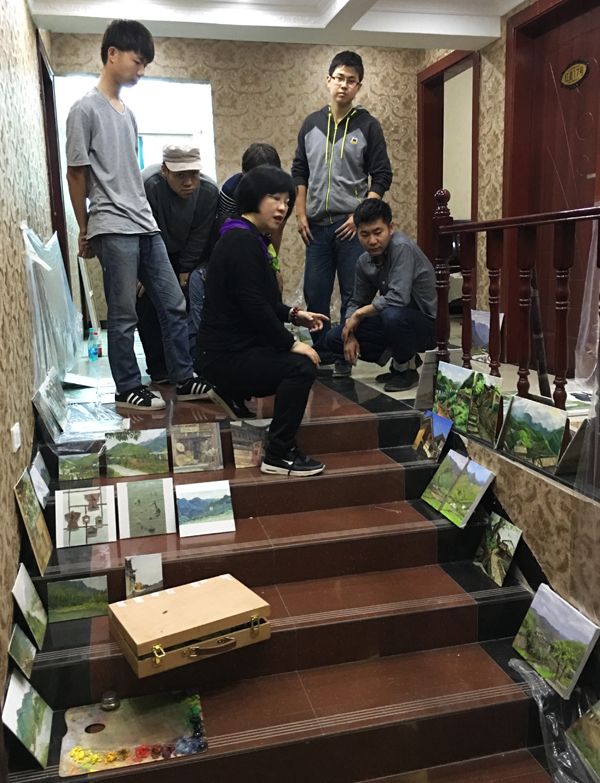 20多位写生的老师同学入住后,星星客栈成了临时的“艺术家公寓”,一层二层狭窄的楼梯间、走廊成了“小画廊”,同学们写生回来的画摆满了走廊。细心的叶南老师为了避免弄脏客栈的墙壁,专门把保鲜膜糊在了墙上。晚上,这里也便成了交流体会、讲评写生的课堂。