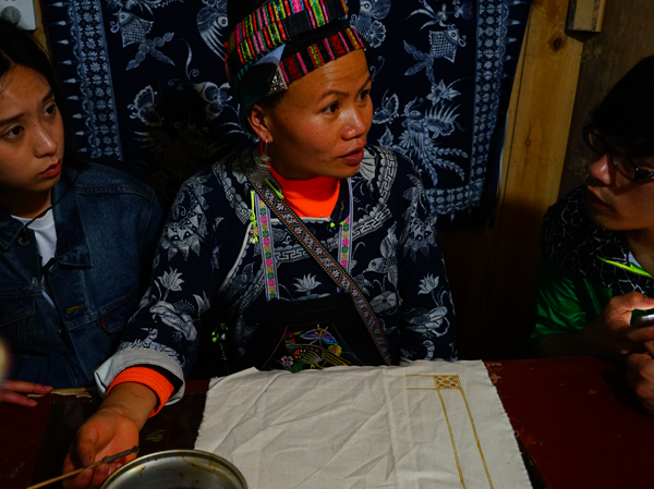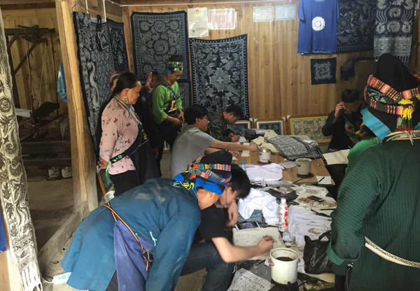我们考察学习蜡染的鸡家村是黔东南地区典型的苗寨村子。常住村里的青壮年人口很少,农忙时人会从城镇回来一些。村里的小学已完全撤并到镇上,初、高中学则撤并到县城。孩子上学一走,父母打工陪读,剩下老人留守寨子。在县城上学的苗寨女孩子们跟父母学习画蜡花、做蜡染的越来越少,几近为零了。原先按苗寨的传统,女儿一出生,妈妈即开始为她准备画蜡绣花做嫁衣,自古没有文字的苗族人用图画记录传承苗族的历史文化,有“穿在身上的历史”的说法。但久在苗寨之外上学的女孩子们都渐渐倾向结婚穿婚纱,像母辈们学习蜡染的女孩子也非常少了。后继无人令人担忧。