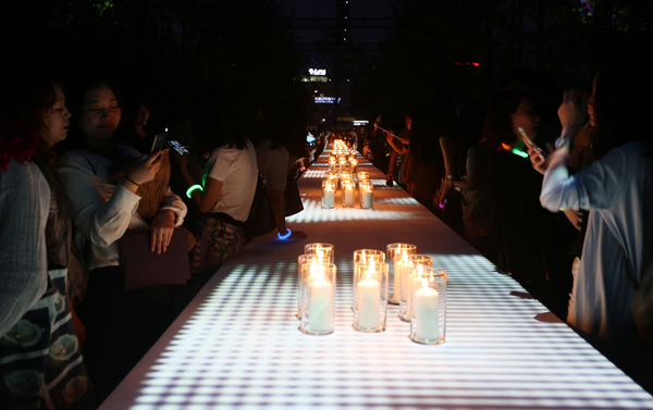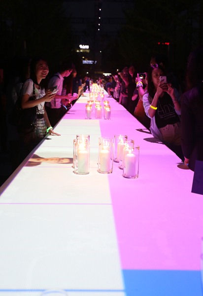 暮色缓缓降临,银杏树下,绿草坪间,60米长的白色烛台点亮,曼妙的灯光秀投射来迷人的色彩,“2016中央美院毕业季”在五彩斑斓中点亮。