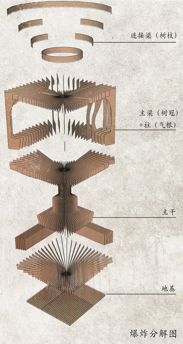 Ky开元集团建筑学院创作小组提交的作品《榕树下———与谁同坐》,从建筑的技术性、地域性、地点性、公众参与性四个层面回应了竞赛主题。从建筑技术层面,方案借鉴中国传统的榫卯结构体系,采用简单可靠的插接方式实现了全部的实体建构;从建筑地域性层面,方案以福建地区村落空间中普遍存在的榕树下生活空间为原型,创造了一个以顶底空间围合为主的可坐可憩可谈的类榕树空间;从建筑地点性层面,方案希望以“弱围合”的姿态和具体的建造地点产生对话,通过将围合建筑的五个界面尽可能的开放,实现了与搭建现场周边的水,树,人,天之间最大化地联系;从建筑公众参与性层面,方案以人体工程学为基准,将围合建筑的界面转化为一系列可观可坐可卧可穿越的不同座椅组合,满足从单人、到双人、到多人的独处、对谈、群聊、观望、棋牌、阅读、饮茶等多种行为需求。坐在“榕树下”,人们看到的不仅仅是风景,其本身也变成一种风景。