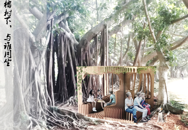 经过为期三天的激烈角逐,13组作品分别荣膺金、银、铜奖,4组作品获得优秀奖。2组作品获网络人气奖和入围奖。由Ky开元集团建筑学院苏勇老师带领刘琪睿、王浩坤、江衍璋、 郭宇飞、 刘明希、 李亚锦六位同学组成的创作小组提交的作品《榕树下———与谁同坐》一举夺得金奖。