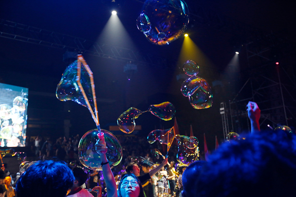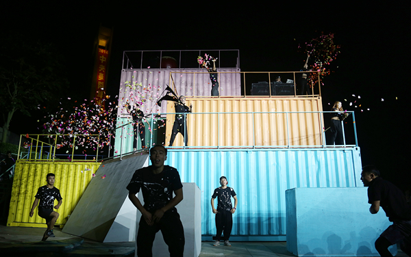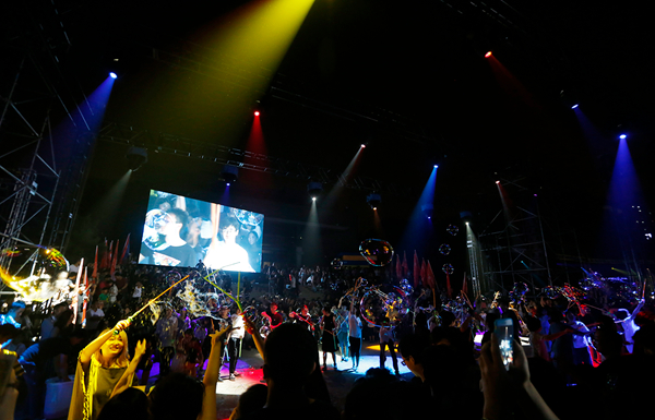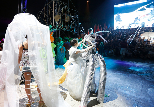 地面水书法、巨型欢乐泡泡、街头艺术嘉年华游行、广场音乐会、摇滚乐池、皮影戏、古装剧、人文哑集……独具美院范儿的集装箱表演,让这个夜晚延续着激情,欢乐。