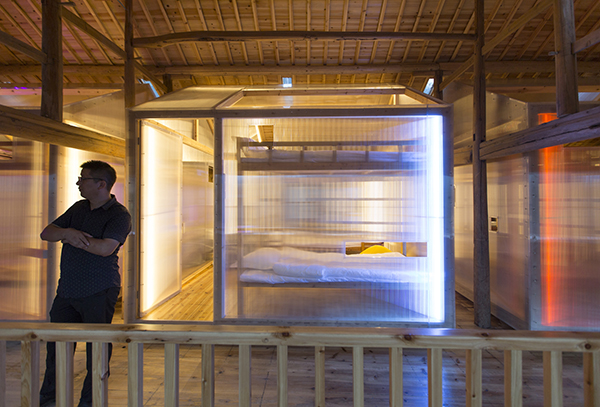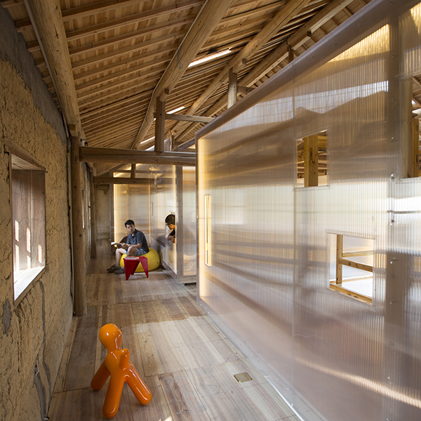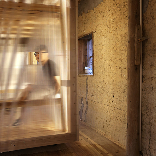 “爷爷家青旅”反映了何崴老师对于普通乡村民居改造和活化的一种思考和尝试。建筑由一栋具有百年历史的乡村夯土民宅改造而成,因为原建筑的主人是业主的爷爷,所以设计师将新建筑命名为“爷爷家青年旅社”。设计强调新与旧的对比和对话,在保留建筑外观风貌与原有村落环境相融合的同时,何崴老师大胆地在建筑室内引入全新材料和空间元素。三座可移动、半透明的轻质盒子——“房中房”被安放在室内。它们在功能上是青旅的居住单元,在视觉语言上则以一种极大的反差与老建筑的空间元素形成对话,使新者更新,旧者更旧,形成富于戏剧性的张力效果。在建筑师看来,与其混淆新旧元素还不如明确的区分新旧,在对比中完成对老建筑的活化。