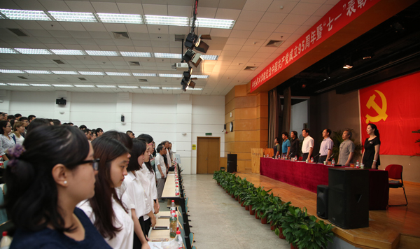 95名新党员面对党旗庄严宣誓,全体老党员重温了入党誓词。大会在雄壮的《国际歌》中结束。