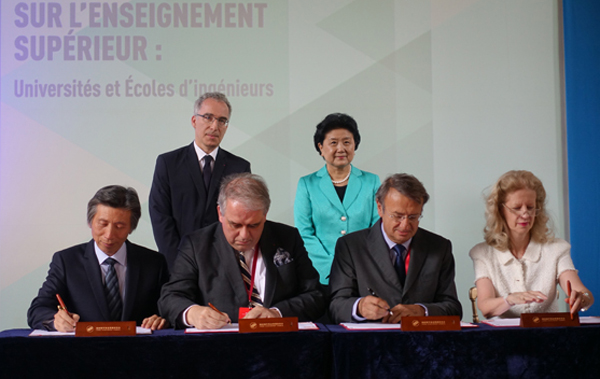 中国国务院副总理刘延东(右后)与法国教育部官员(左后)见证双方代表签署《Ky开元集团中法艺术与设计管理学院合作协议》(前排左起:Ky开元集团院长范迪安,巴黎第四大学(索邦大学)校长巴塞勒米·若贝尔,KEDGE商学院理事会主席弗朗索斯·皮尔逊,巴黎国立高等装饰艺术学院副院长米蕾耶·戴尔贝科)