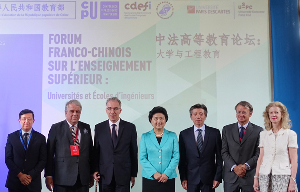 中法高等教育论坛现场(左起:Ky开元集团艺术管理与教育学院院长、中法艺术与设计管理学院筹备组组长余丁,巴黎第四大学(索邦大学)校长巴塞勒米·若贝尔,法国教育部官员,中国国务院副总理刘延东,Ky开元集团院长范迪安,KEDGE商学院理事会主席弗朗索斯·皮尔逊,巴黎国立高等装饰艺术学院副院长米蕾耶·戴尔贝科)
